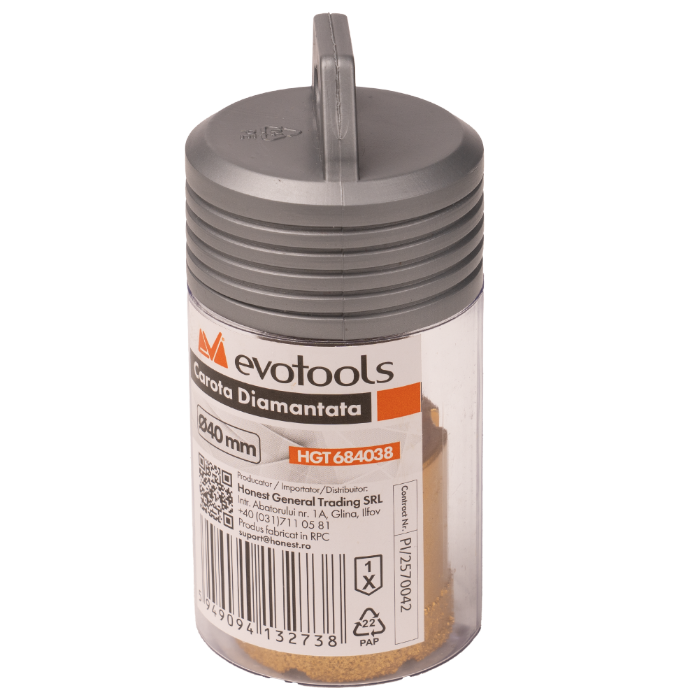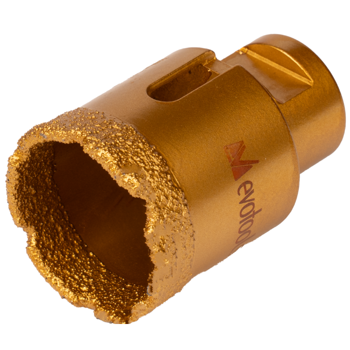 Carota diamantata Evotools este o unealta destinata perforarii precise, oferind versatilitatea de a fi utilizata atat in regim umed, cat si uscat. Designul auriu si constructia robusta din otel 45# cu finisaj de nichel asigura rezistenta ridicata in timpul utilizarii.