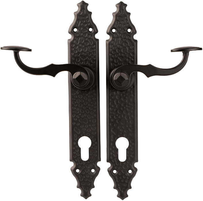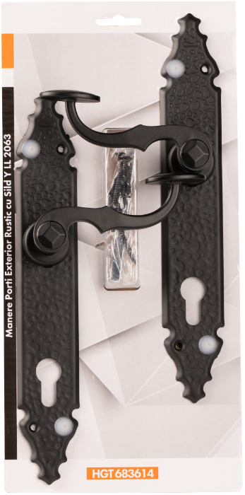 Mânere porți exterior rustic cu șild Y LL, realizate din oțel rezistent pentru sild și cu mâner din aluminiu, acoperite cu un strat rezistent de vopsea.